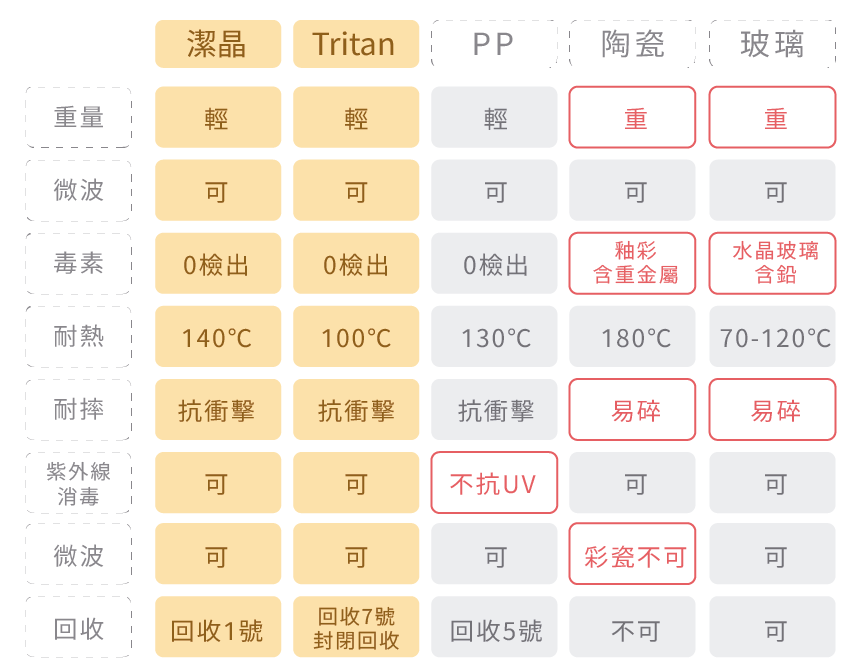相較之下,Tritan 與 CPET 的材質則兼具 輕巧、耐摔、安全無毒 的特點。檢驗皆不含雙酚 A 與塑化劑,